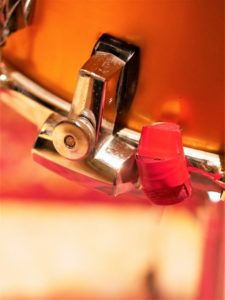 La Premier Resonator était vendue complète, c’est le cas de celle-ci où tout est d’origine sauf la pédale de charleston qui est de la marque Orange (probablement de la même époque).